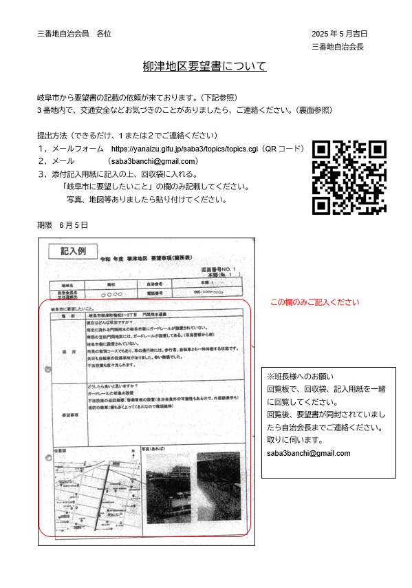 3番地内で、交通安全などお気づきのことがありましたら、メールフォームよりご連絡ください。
